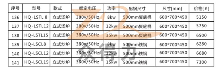 立式湯爐及炒爐相關(guān)技術(shù)參數(shù)及統(tǒng)一報(bào)價(jià):