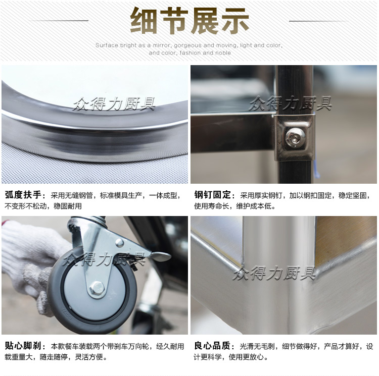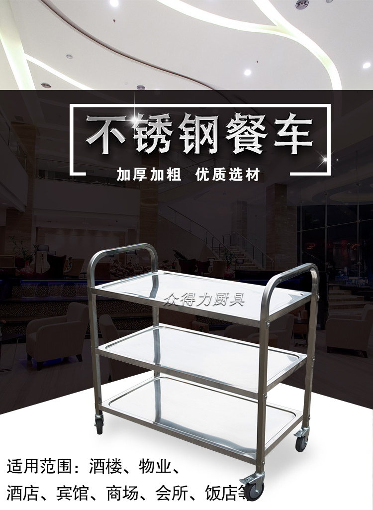 江西眾得力廚具有限公司生產(chǎn)銷售商用廚具,食品機(jī)械,提供中央廚房工程項(xiàng)目整體解決方案。不銹鋼餐車有大號(hào)、中號(hào)、小號(hào),本公司生產(chǎn)銷售的不銹鋼餐車系列均采用201無(wú)磁不銹鋼材質(zhì),板材厚度足0.8mm,整機(jī)拆裝方便,結(jié)構(gòu)牢固,承重能力強(qiáng)。