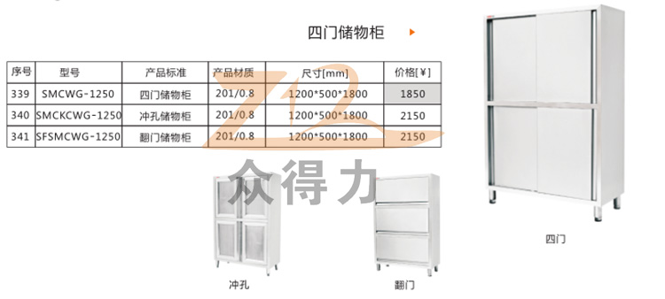 江西眾得力廚具有限公司生產(chǎn)銷售食品機(jī)械和商用廚具系列設(shè)備,為您提供中央廚房整體解決方案。本產(chǎn)品為四門儲(chǔ)物柜系列,有沖孔、翻門 四門之分,均為四層儲(chǔ)物柜系列。