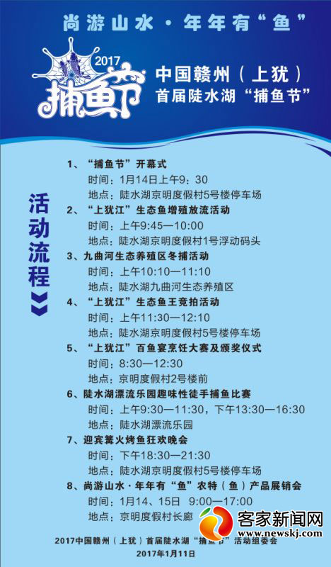 摘自客家新聞網(wǎng):2017尚游山水·年年有“魚”中國贛州(上猶)首屆陡水湖“捕魚節(jié)”盛大啟幕,2017年1月14日-15日兩天時間里,將開展“上猶江”生態(tài)魚增殖放流、九曲河生態(tài)養(yǎng)殖區(qū)冬捕、“上猶江”生態(tài)魚王競拍、“上猶江”百魚宴烹飪大賽、篝火烤魚狂歡晚會、陡水湖趣味性徒手捕魚比賽,以及“多彩上猶”魚品、油畫、奇石展銷會等系列活動。
